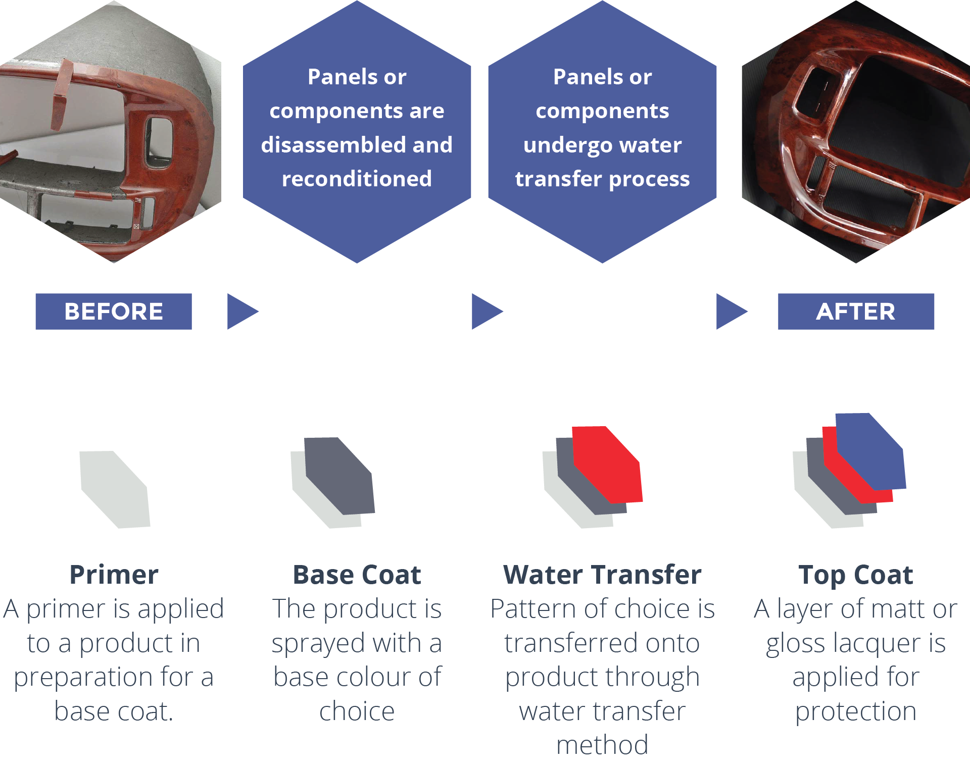 Hydrographics or Water Transfer Printing is a process that allows a design or pattern to be transferred onto the various surfaces that include: