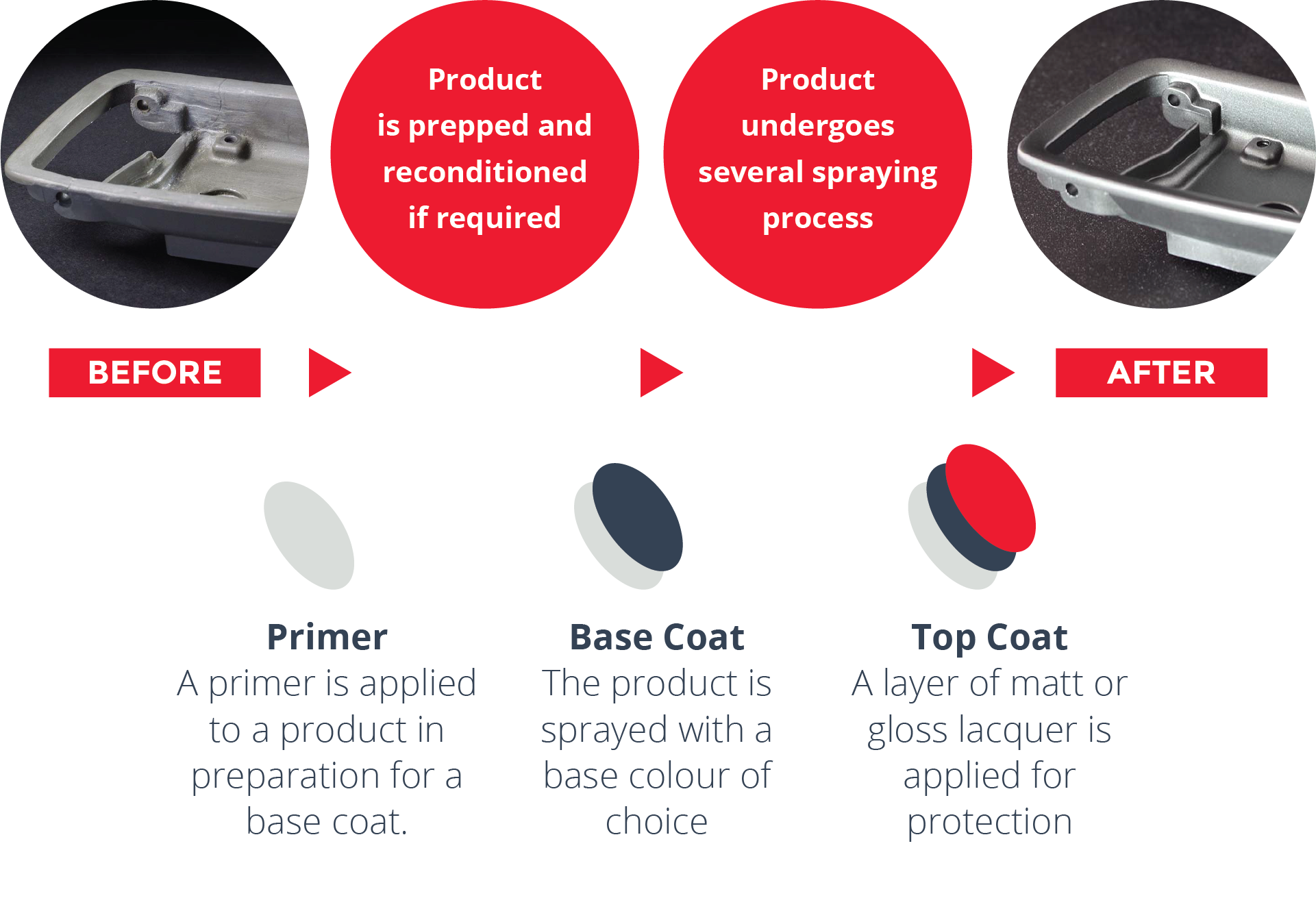 Spray painting is a simple coating process of applying paint through spraying technique. However, it is important that the product or item is conditioned properly to guarantee a good and lasting finish.